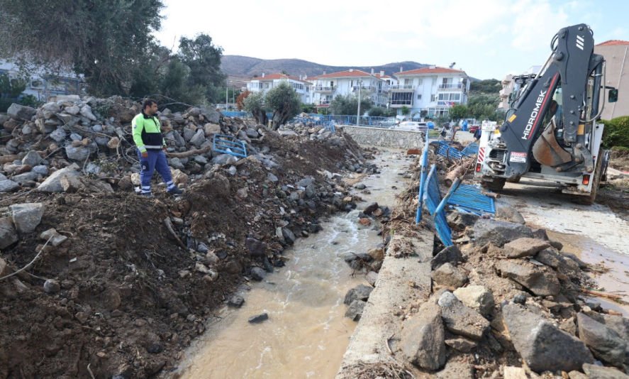 Dün meydana gelen aşırı yağışların sel ve su baskınlarına neden olduğu Foça’da yaraların sarılmasına yönelik çalışmalar sürüyor. Yağış sırasında sel sularına kapılarak dereye düşen otomobilde olduğu düşünülen kayıp vatandaşı arama çalışmaları da kesintisiz devam ediyor. İzmir Büyükşehir Belediyesi ekipleri selden etkilenen vatandaşlara yapılacak yardımları belirlemek amacıyla ön tespit çalışmaları yapmak üzere sahada çalışmalara başladı.